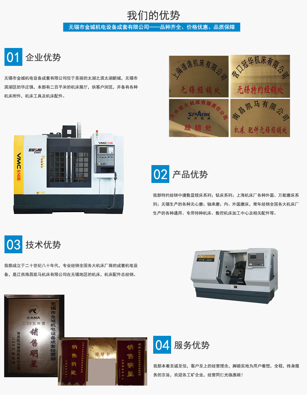 無(wú)錫市金城機(jī)電設(shè)備成套有限公司位于美麗的太湖之濱太湖新城,無(wú)錫市濱湖區(qū)的華莊鎮(zhèn),本部有二百平米的機(jī)床展廳,供客戶瀏覽,并備有各種機(jī)床附件,機(jī)床工具及機(jī)床配件。 我部成立于二十世紀(jì)八十年代,專業(yè)經(jīng)銷全國(guó)各大機(jī)床廠商的成套機(jī)電設(shè)備,是江西南昌凱馬機(jī)床有限公司在無(wú)錫地區(qū)的機(jī)床,機(jī)床配件總經(jīng)銷。系蘭州里海機(jī)床有限公司,天水星火...